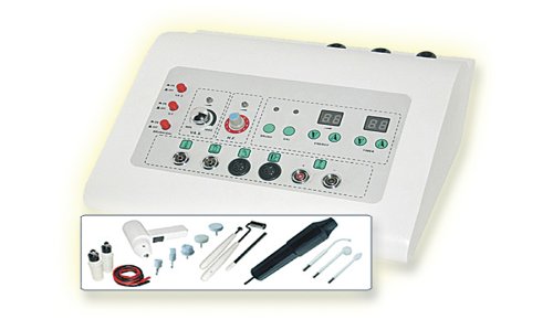 VACCUM:the vacuum function removes any surface debris and aids in the cleansing process.Comes with glass attachments and tubing SPRAY: the sprayer allows you to lightly shower the skin with your favorite revitalizing toner or mist.Comes with 2 spray bottles and tubing HIGH FREQUENCY: An essential for every esthetician,High frequency is an incredible way to invigorate circulation by stimulating cells beneath the skin. High frequency waves have an anti-bacterial action that aid in decongestion of the pores & aid in treating acne clients.Unit includes high frequency handle, acne electrode, spoon electrode and mushroom electrode.The frequencies are adjustable.User Friendly -Easy to Operate. FACIAL BRUSH:Rotary Brush unit. Cleanses, exfoliates, and rejuvenates the epidermis while enhancing blood circulation. Clients skin is left soft and radiant after each session.Unit includes- a brush gun, 1-lrg brush, 1-sml brush, 1-lrg sponge/buffer, 1-sml sponge / buffer and 1-solid surface buffer. GALVANIC: assists in deep penetration of active substances for iontophoresis and desincrustation techniques. Cont: both (+& -) charges.Comes with all attachments